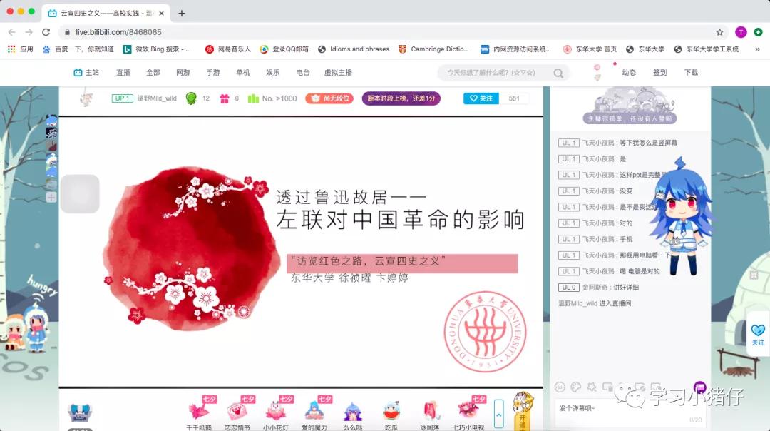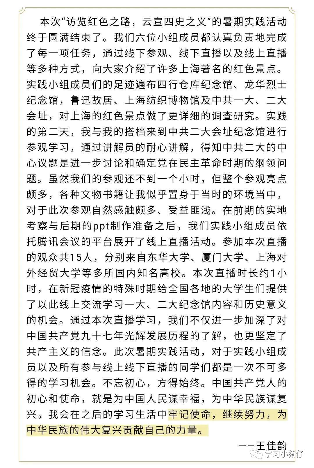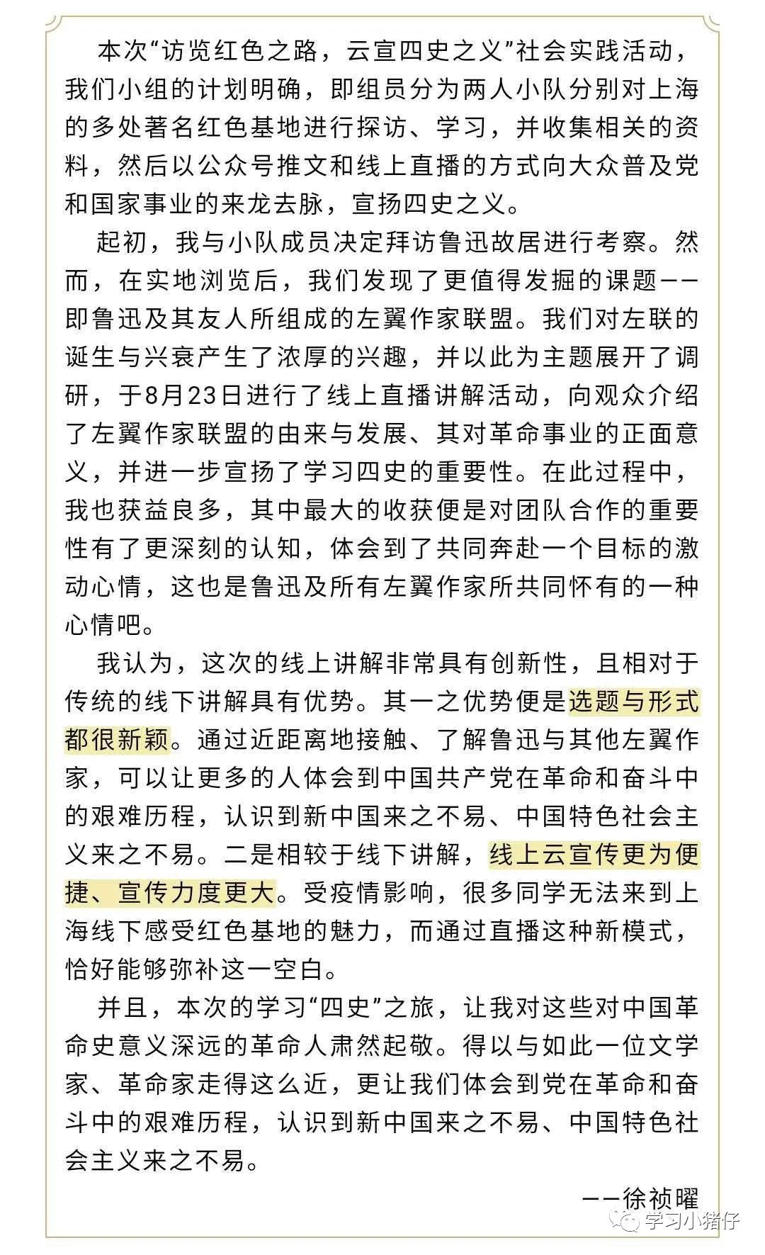 实践正值新冠疫情暴发之际,很多线下活动无法展开,实践组成员们便想到了利用社交媒体、网络直播的方式实现“云宣传”。考虑到直播的时效性、受众群体及便利程度,实践成员们最终选择b站、腾讯会议的方式进行直播,依托b站直播平台进行红色景点介绍及宣传推广,这一方式结合当下最流行的媒介,也更受年轻人的欢迎,b站随时发弹幕评论的功能也使得网上互动变得更加便利,具有创新性。腾讯会议的直播也非常为同学们所熟知,上学期的网络授课都使用了腾讯会议,因此观众们在参加的操作上更为熟练。相较于线下讲解,这两种线上宣传更为便捷、宣传力度更大,消除了天气、距离、交通等一系列不便因素的影响。宣传方式也较为多样,主播可采用实地取景的方式带领直播间观众线上参观红色景点,也可通过PPT等形式进行讲解。但考虑到线上直播仍存在些许问题,观众们无法设身处地感受到红色景点展馆内真实的场景,也无法近距离观看展品,实践组成员最后也争取到了上海纺织博物馆的线下直播机会,同时邀请讲解员一起辅助讲解,给观众们带来了更好的直播体验。四史教育对于炎黄子孙们,尤其是正值青春的广大青年学子们来说,是必不可少的。