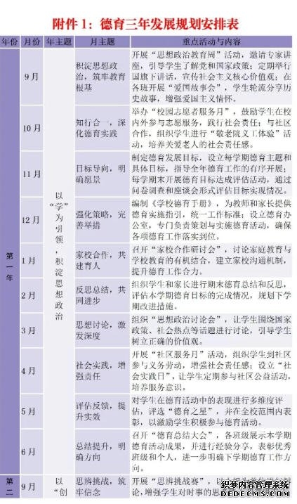 1.德育制度的规范化建设:建立和完善学校的德育管理制度,明确德育工作的各项规章制度和操作流程,确保每一个环节都能有序推进。规范化的制度建设能够为德育工作的持续推进提供保障