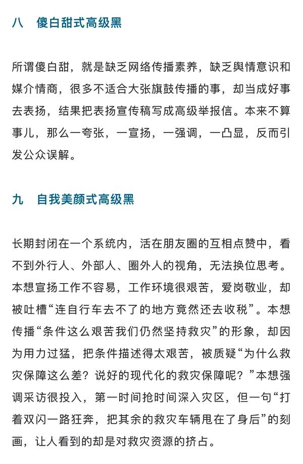 网络传播就是这样,哪怕99.99%都是好的,但被发现有0.01%的问题,也容易被放大。——除非你自己主动面对那0.01%,而不是掩饰和美化。比如领导做秀,其实做秀也不是什么坏事,有时就得秀一下,比如市长为体现对环卫工人的关心,凌晨5点到马路上跟环卫工一起扫马路,体验辛苦。这事儿挺好,网友不会吐槽,但为什么新闻上网后跟帖一片骂声呢,就因为多加了两个字:偶遇。记者偶遇市长如何如何,这就是高级黑了,让人感觉太假。