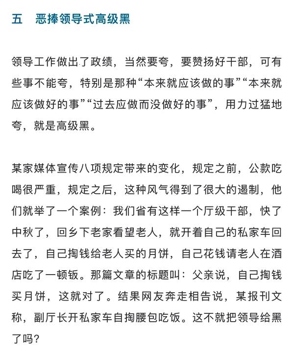 某地创建全国卫生城市,领导高度重视,都上街扫地,一张照片摆拍,一群领导在扫地。——这样塑造领导形象,看看后面的网评:领导都在扫什么?扫的是寂寞吗?地上本来没有东西,扫着扫着就有东西了。你看,黑得好惨,其实不是网民黑的,而是那种“摆拍照”把领导给高级黑的。